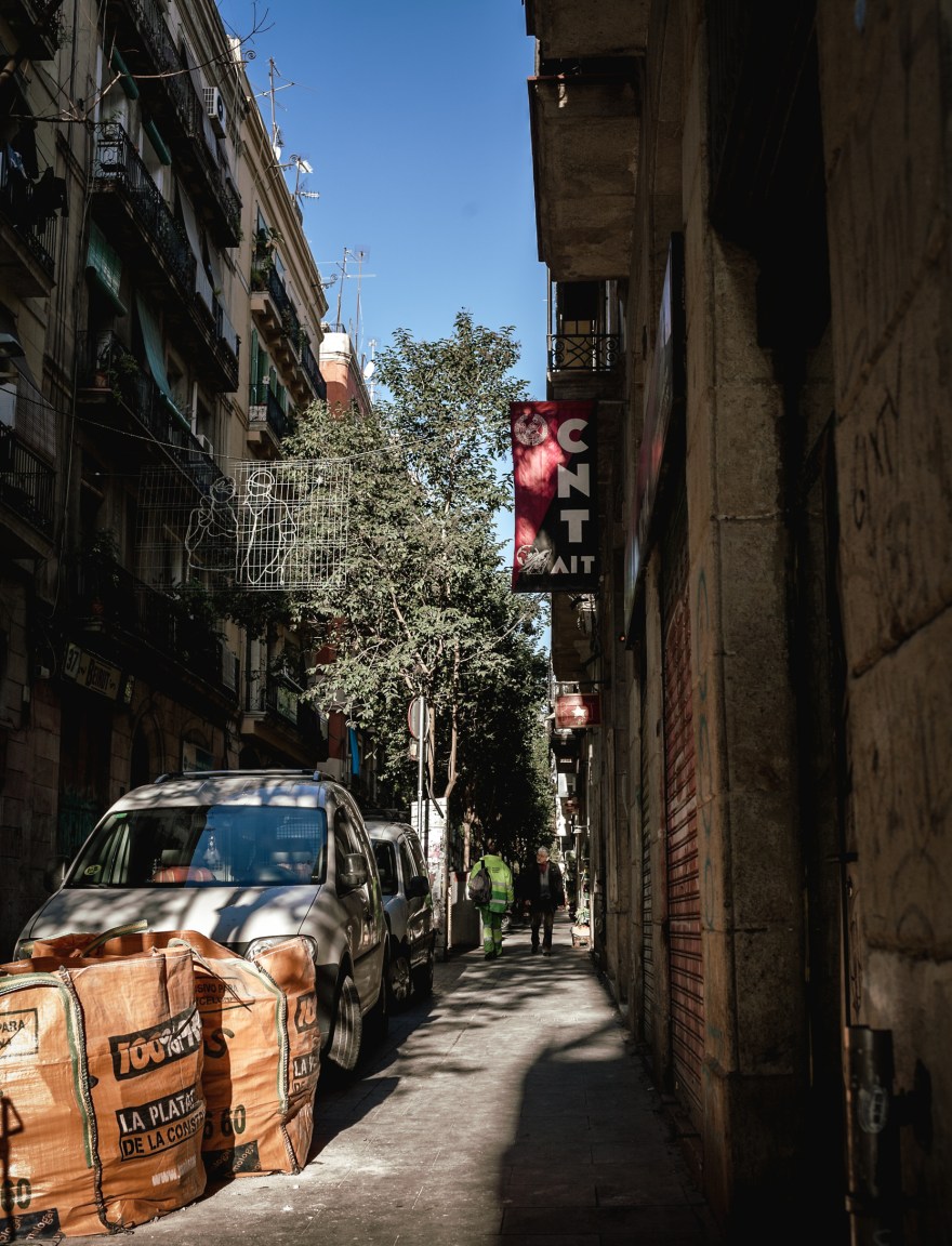 Despite its cool bars, vintage clothes shops, designer outlets, and other signs of gentrification, El Raval still clings to its traditional roots as the heartland of social radicalism in Barcelona. A stone’s throw away from MACBA, large red and black banners can be seen hanging from the Catalonian headquarters of the anarcho-syndicalist trade union, the CNT (Confederación Nacional del Trabajo or National Confederation of Labour), which played a primary role during the revolution of 1936-37.
